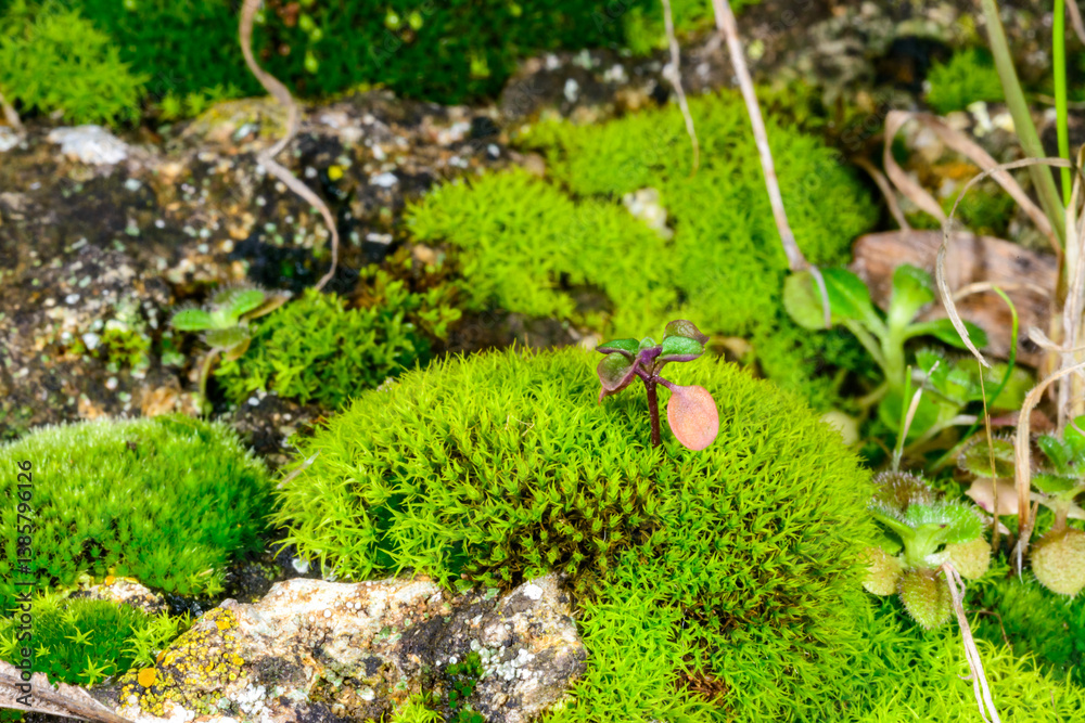 Lichens and Grey-cushioned grimmia or pulvinate dry rock moss Grimmia pulvinata, green moss with young sporophytes on stones in spring