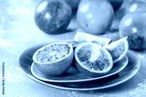 Sliced and whole ripe juicy Sicilian Blood oranges fruits on ceramic plate over blue concrete texture background. Selective focus