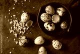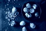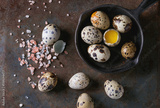 Whole and broken quail eggs with yolk in shell and pink sea salt crystal in small iron cast pan over old rusty texture metal background. Top view with space