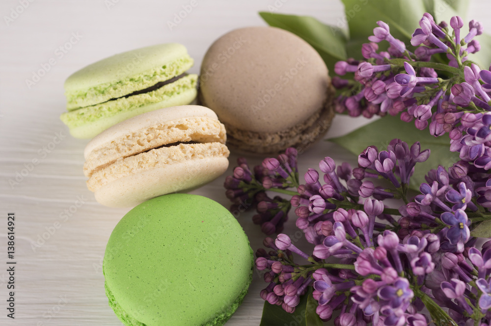 French macarons with twigs of lilacs. Close-up. Background with flowers and macaroons.