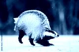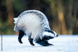 European Badger Running Across Snow in Its Natural Forest Habitat. Meles meles
