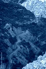 Winding road cuts through the rugged mountains of Parnon. Serpentine route carves into rocky cliffs surrounded by thick forest, offering thrilling drive through remote and wild Peloponnesian landscape