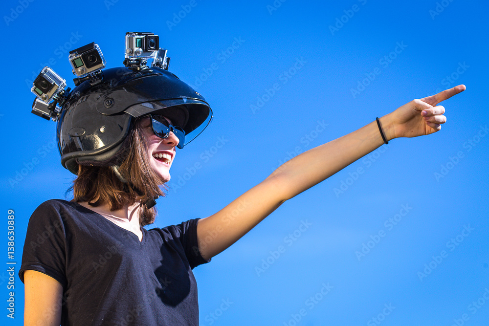 une jeune femme avec quatre caméras de sport sur la tête ,collées sur un casque indique une direction avec son bras