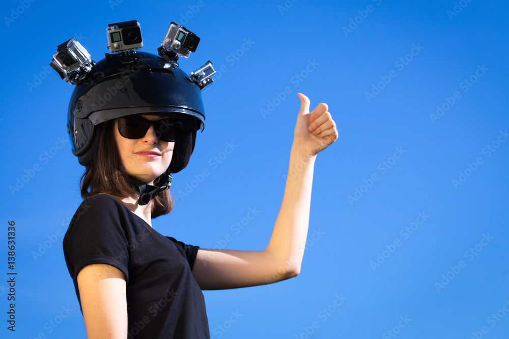 Une jeune femme, le pouce levé, porte un casque avec quatre caméras de sport fixées dessus