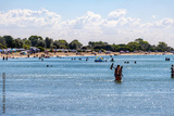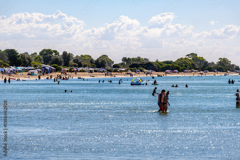 A crowded summer day at Portarlington Swimming Beach, VIC, Australia, with numerous Australian people wading in the shallow water and relaxing on the sandy shore. Holiday atmosphere and vacation vibe.