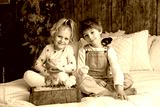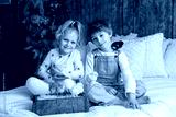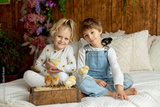 Cute sweet little children, blond boy and girl, playing with little chicks at home,