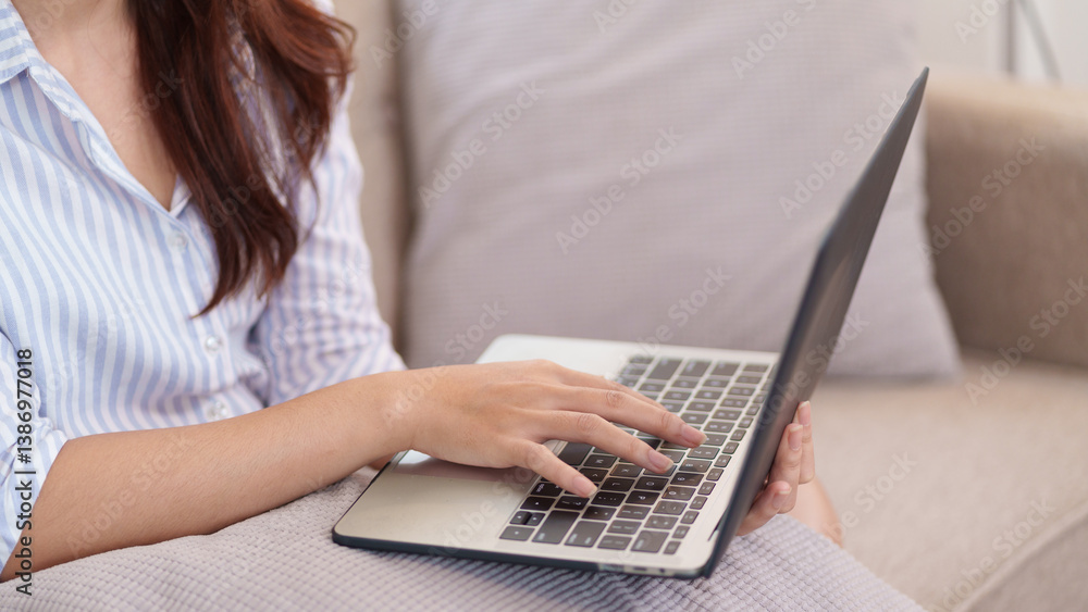 Digital Work in Living Room: The image captures a person engrossed in their laptop, nestled on a couch in a well-lit living room, a visual testament to remote work and home comforts.