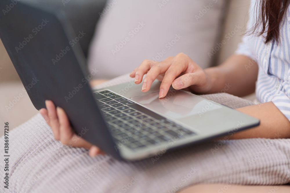 Laptop in Hand: A close-up shot of a person's hands delicately using a laptop, highlighting the modern work-from-home scenario and the digital world