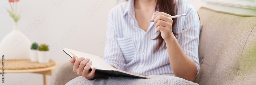 Quiet Contemplation: A woman finds solace and focus while taking notes, poised pensively on a soft sofa, surrounded by the quiet ambiance of a peaceful sanctuary.