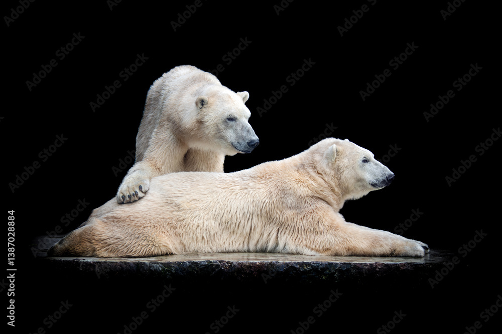 Two polar bears resting peacefully on a stark black background showcasing their white fur and serene demeanor