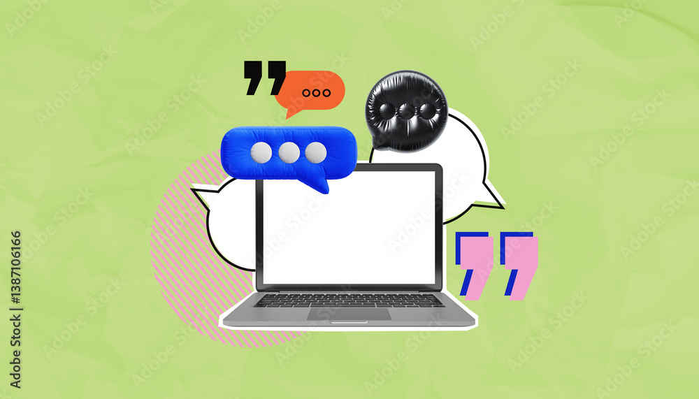 Laptop with colorful speech bubbles and quotes on green background collage style.