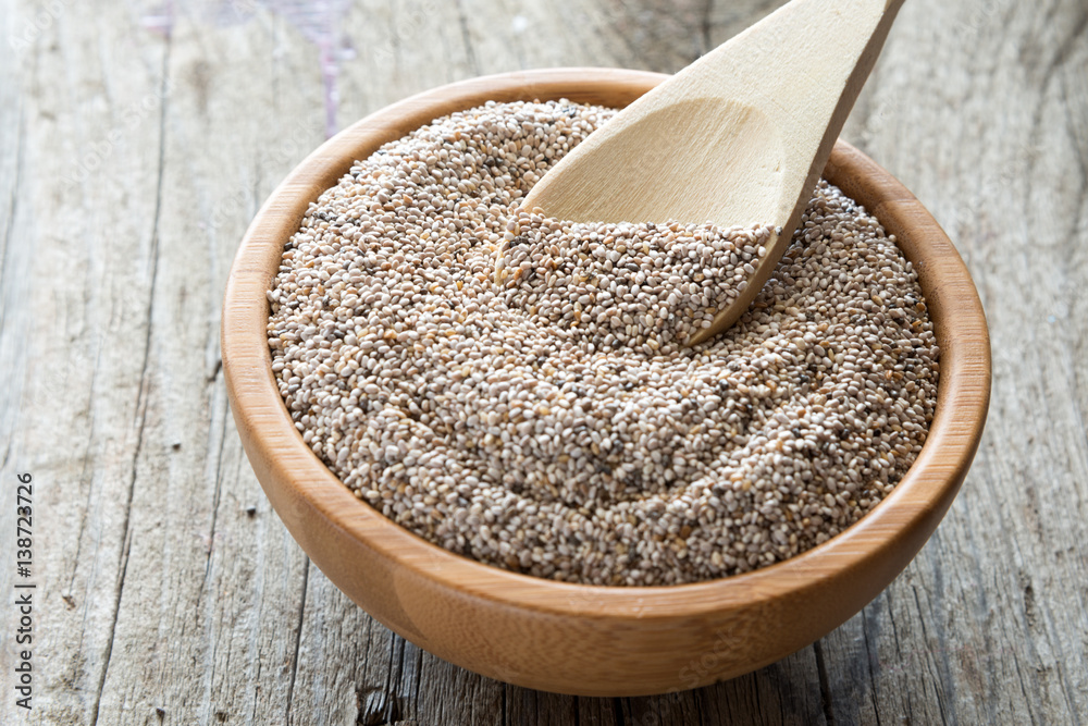 Weiße Chiasamen in Holzschälchen mit Holzlöffel