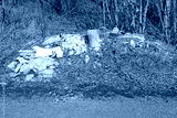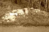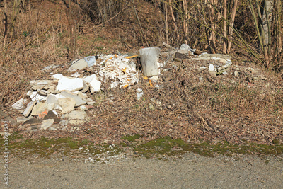 Large household waste and garbage, lying in the green area by the road. Environmental pollution and crisis. Construction waste, illegally dumped in a populated area. Dangerous environmental situation