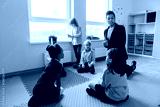 An adult Latino female teacher leads a learning activity with a diverse group of elementary school students in a classroom. The room includes colorful floor mats, shelves, and storage containers.