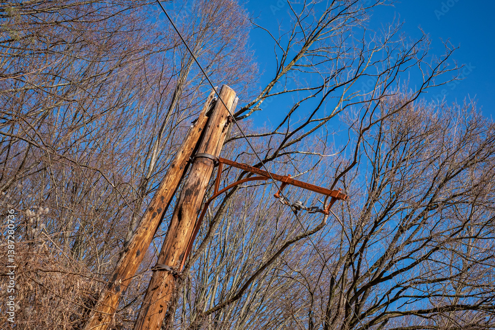 old wooden poles and electricity cable from an old tram near the forest, Sibiu city, Romania