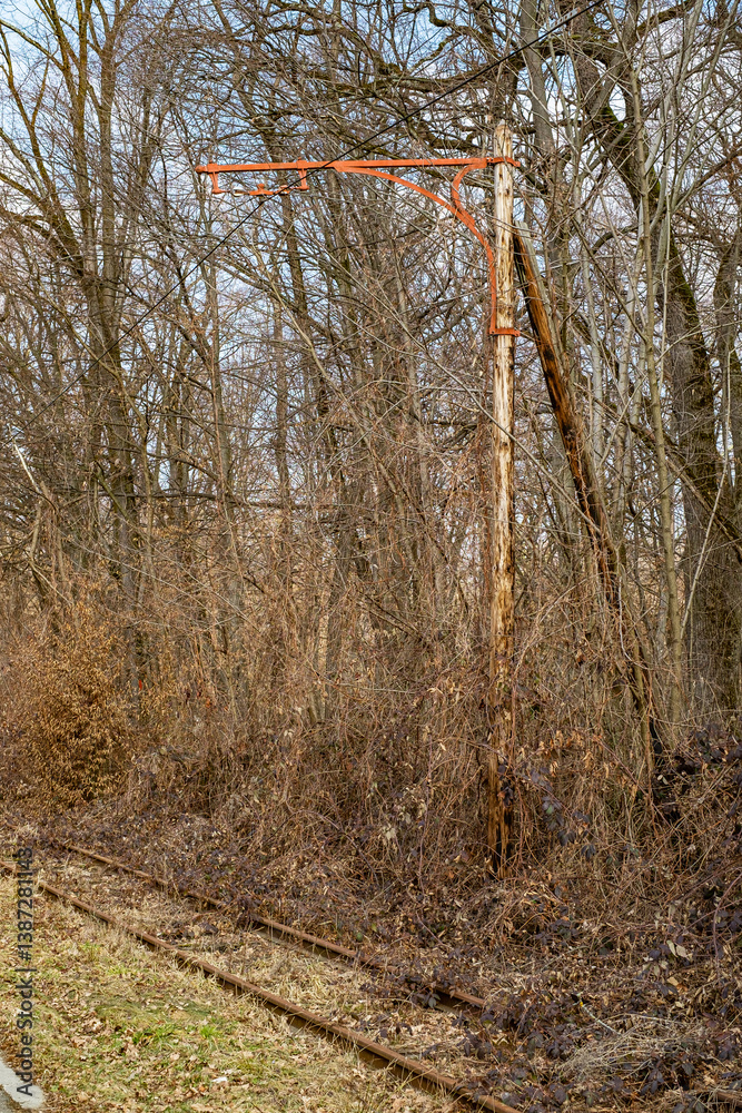 old wooden poles and electricity cable from an old tram near the forest, Sibiu city, Romania