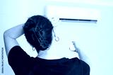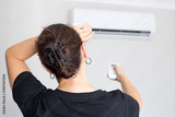 A woman, feeling the heat, reaches up to activate her air conditioner with a remote control for a cool environment.