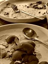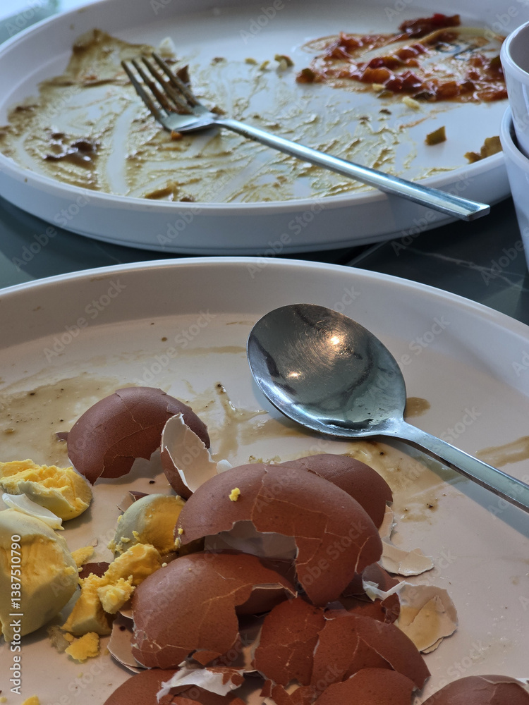 messy breakfast scene featuring empty plates, eggshells, and utensils, showcasing remnants of meal. image captures aftermath of hearty breakfast
