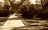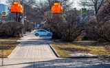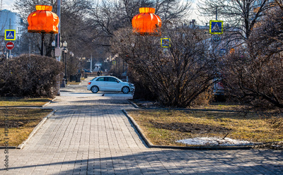 A white car on the road in the park.
