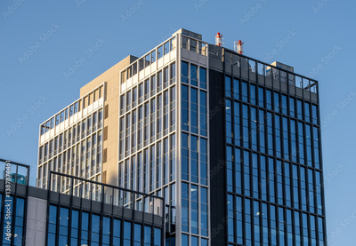A high-rise building made of glass and concrete in close-up.