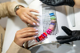 Client chooses nail color for her gel polish. Professional manicure helps her.