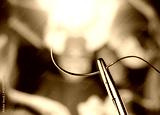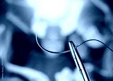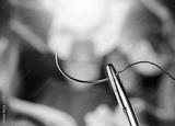 Hemostatic forceps holding half circle cutting needle and suture in front of of blurry operators under the lights in operating room. The surgical team working in an operating room.