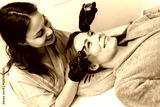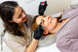 Beauty professional applying eyebrow tint to a woman's brows using a fine brush.