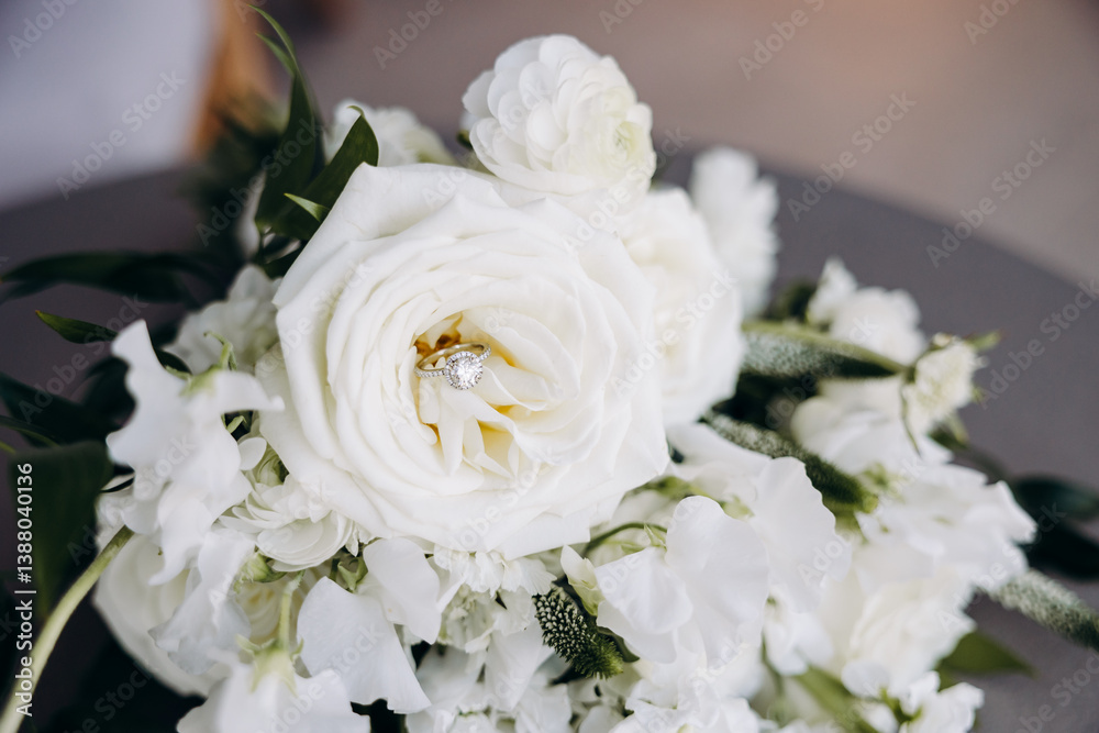 Wedding. The bride's ring is resting on a bouquet of white roses