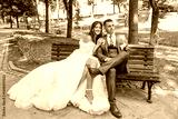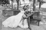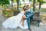 An attractive wedding couple sits on a bench. The beautiful bride and groom enjoy a peaceful moment in a scenic outdoor location.