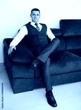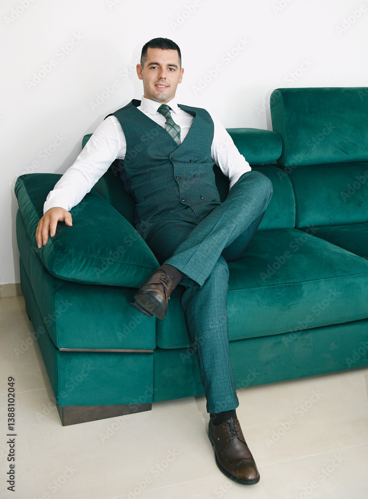 Stylish young man in a deep green suit, sitting on a couch, exuding confidence and timeless elegance. Business or wedding celebration concept.