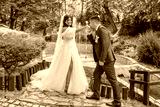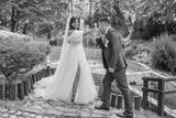 A beautiful bride and groom enjoying a peaceful moment in a scenic outdoor location. The groom kisses the bride's hand in a romantic scene on their wedding day. Love is in the air.