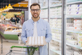 Smiling Customer Holding Tray of Eggs in Supermarket