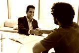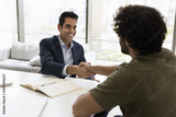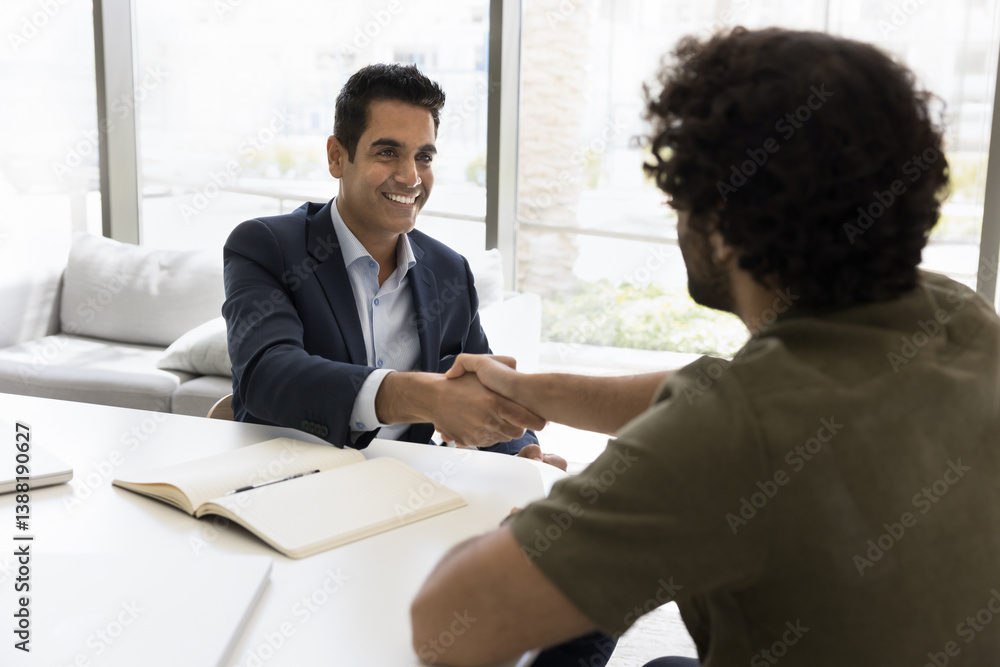 Smiling Indian businessman shaking hands, greeting company client, start negotiation, welcoming male applicant, congratulate candidate for successfully passed job interview, hr, hiring, making deal