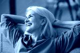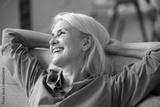 Optimistic aging. Close up portrait happy content senior adult lady retiree sit on comfy couch in relaxed pose looking aside with serene smile enjoy home comfort peace of mind feel satisfied with life