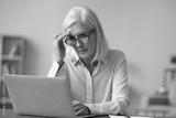 Troubled over business. Concerned worried senior lady accountant entrepreneur in glasses sit at office desk study report on notebook screen pondering company debt project bankruptcy financial problems