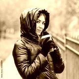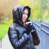 Girl in autumn or spring in a black jacket with a coffee or tea in hand, outdoor. Resting in the city. Life style. Business woman in the hood.