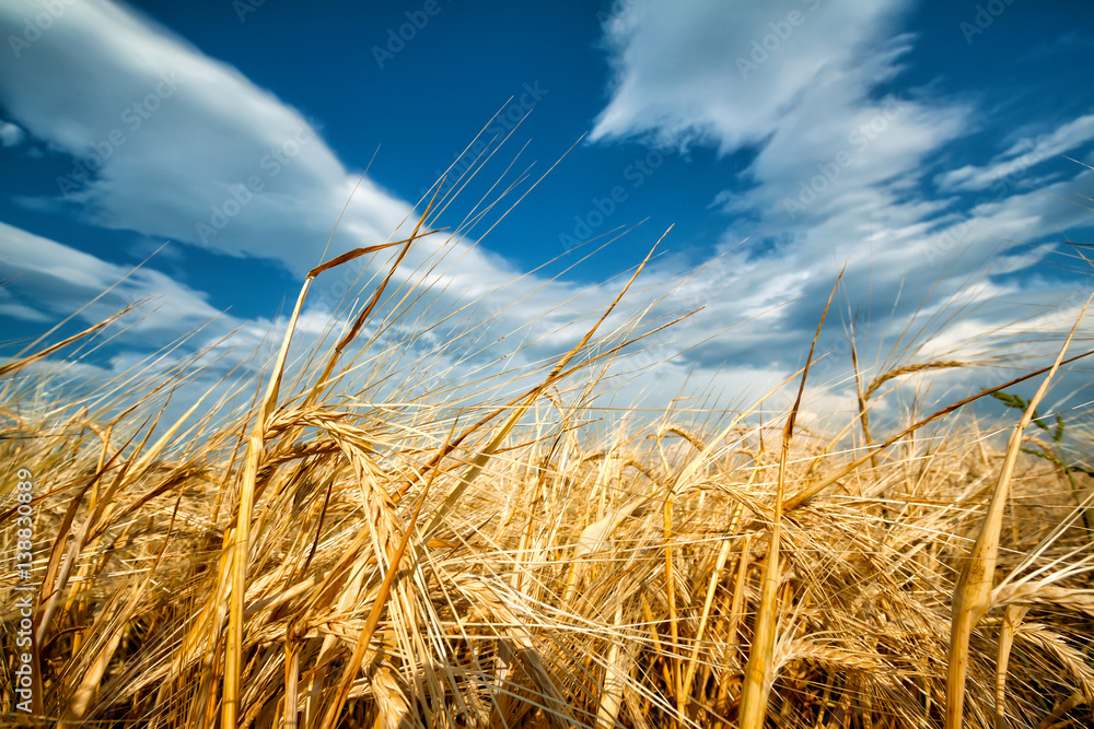 Golden ears of wheat against the blue sky