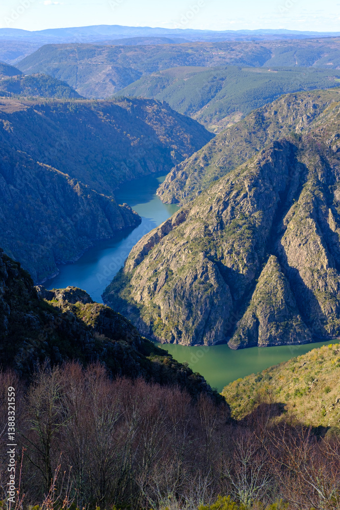 Drone view of river and mountains in Sil Canyon, Ribeira Sacra. Galicia, Spain