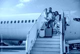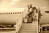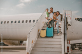 A joyful family with their children boards a plane at the airport, eagerly ready for an exciting journey