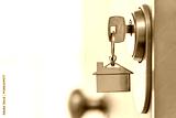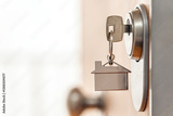 Close up of house key with keychain into door lock. Real estate and home security. Copy space.