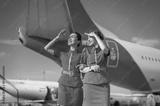 Two flight attendants in retro uniforms stand in front of a colorful airplane, showcasing airline history.