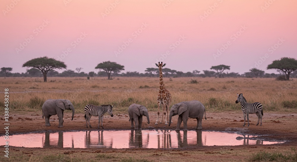 African Safari Sunset Elephants Zebra and Giraffe at Watering Hole