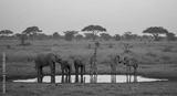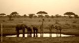African Savanna Sunset Elephants Giraffe and Zebras at Watering Hole
