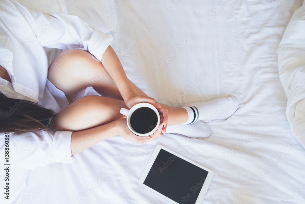 Relaxing young woman enjoying her coffee while sitting in bed.