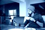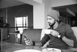 Young handsome hipster man with beard sitting in cafe using a mobile phone, holding cup of coffee.