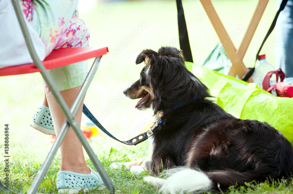 dog lays near the human legs outdoor