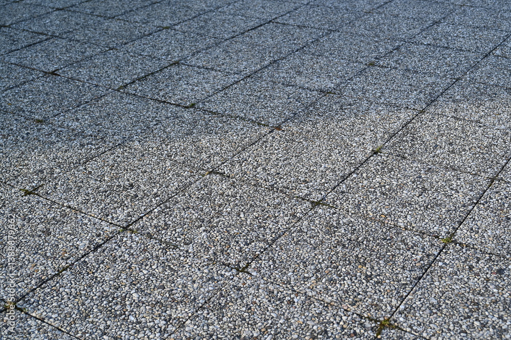 Granite paving stone texture with rectangular tiles. Rough stone surface background for architecture, design, and 3D rendering projects. Natural gray pavement pattern with visible joints.