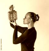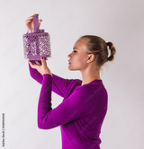 Attractive young woman, with magenta dress looks concern in a candlestick