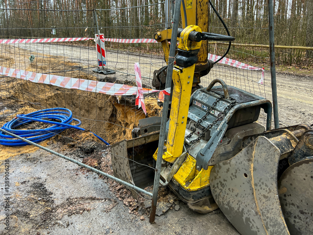 Fenced excavations in the ground along the road during construction of the sewage system
