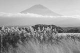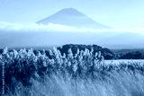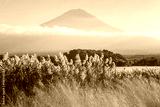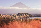 Nostalgic film effect photo of Mount Fuji at Lake Kawaguchi Japan with soft tones, golden reeds, kochia bushes and misty clouds creating a dreamy autumn atmosphere